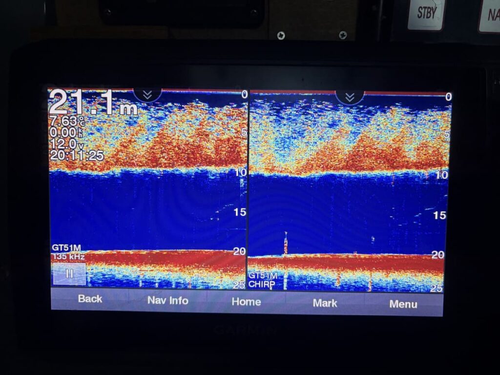 魚群探知機(海の中を見るモニター)を見ると……画面が真っ赤っか! これは「ベイト(小魚などのエサ)」の群れです。