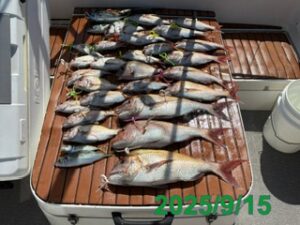 10月13日湾内マダイ釣り 2024年10月13日 最終更新日時 : 2025年3月19日 船長 若潮 満潮12:42 干潮5:38 日出5:45 出航5:00。6名様お疲れさまでした。本日は最初から最後まで流し釣り。マダイ釣り初めての2名様。レンタルロッドとレンタルリールで見事に5枚ゲット😄サメもたくさん釣れました😓 Follow me! @turitamuchango FacebookXBlueskyHatenaCopy