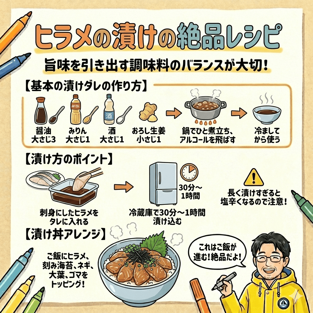 刺身にしたヒラメを漬けダレに入れ、冷蔵庫で30分〜1時間程度漬け込みます。長く漬けすぎると塩辛くなるため、程よい時間で引き上げましょう。 - 漬け丼アレンジ