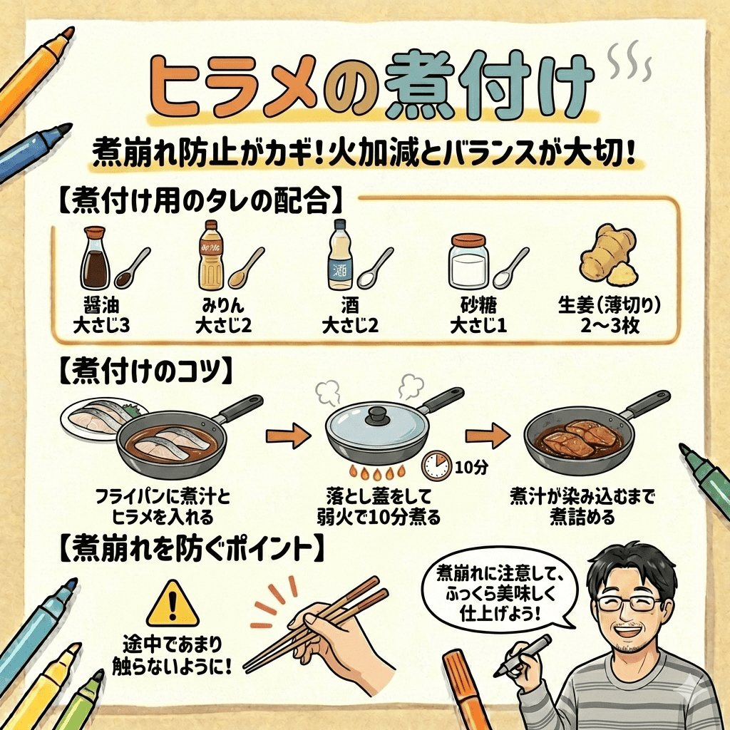 3. 煮汁がヒラメにしっかり染み込むまで煮詰める。 - 煮崩れを防ぐポイント