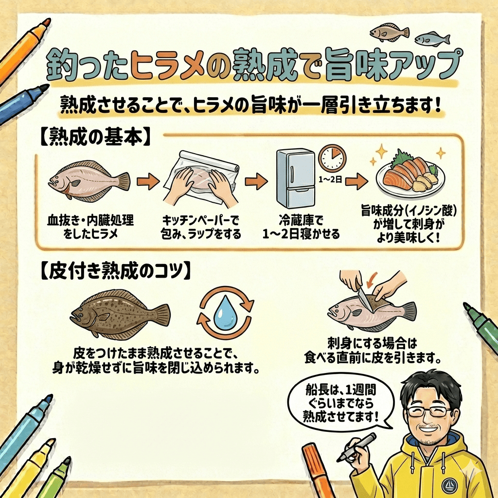 血抜き・内臓処理をしたヒラメをキッチンペーパーで包み、ラップをして冷蔵庫で寝かせます。1〜2日程度熟成させると、旨味成分(イノシン酸)が増して刺身がより美味しくなります。 - 皮付き熟成のコツ