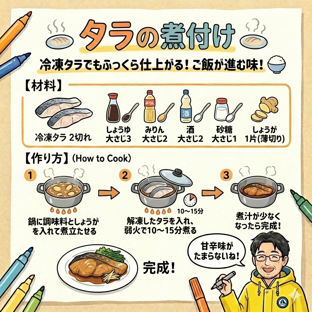 冷凍タラは煮付けにすると、ふっくらとした仕上がりになります。