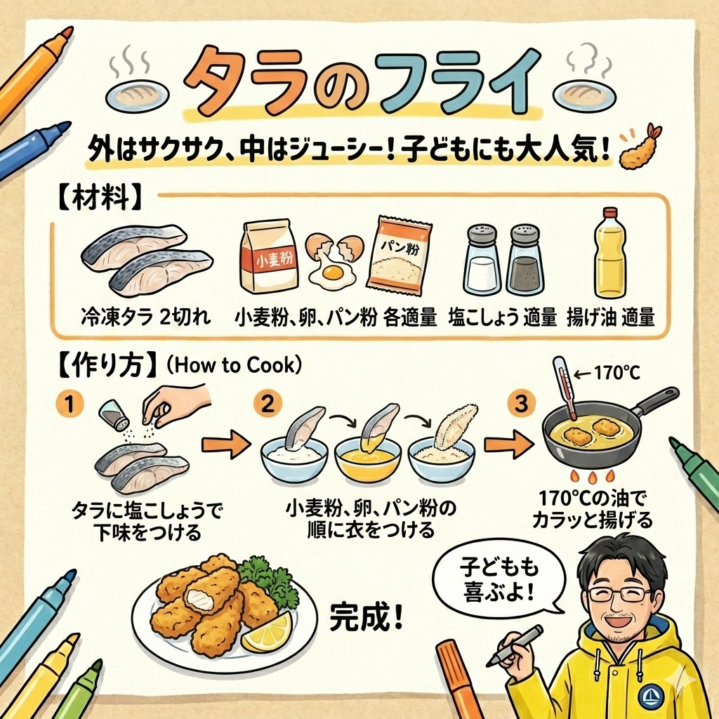 外はサクサク、中はジューシーなタラフライは、子どもにも人気です。