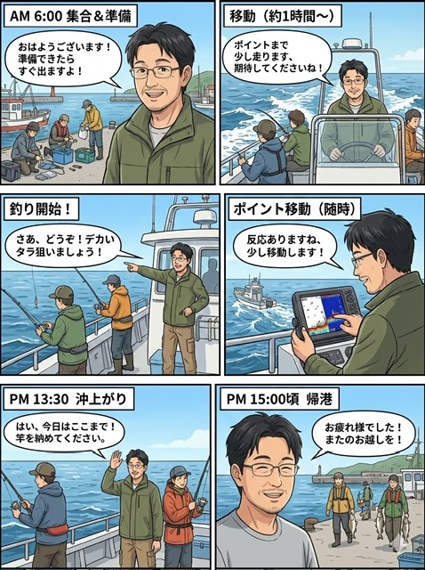 ※船を立てている(操船している)時は、魚の取り込みや血抜き処理など各自でお願いします